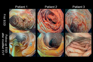 Dada la imposibilidad de las terapias endoscópicas convencionales y el alto riesgo quirúrgico, se indicó una TEV intragástrica para hemostasia, mejora de la perfusión y reparación de la mucosa (Figura 1).