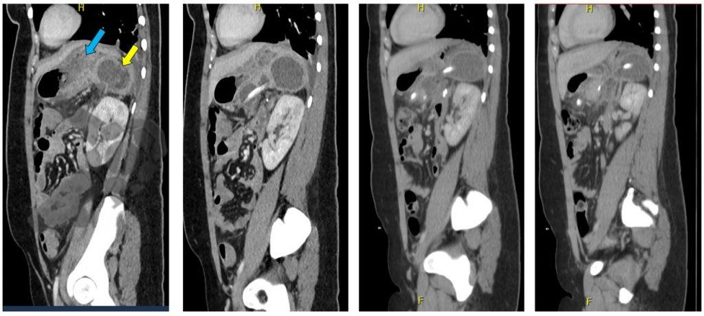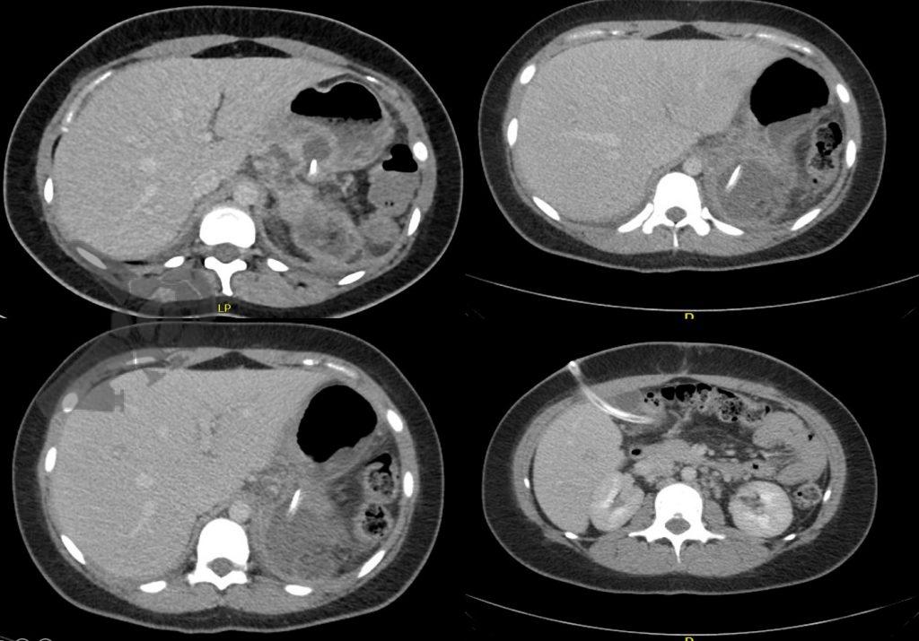 - TC de abdomen revela colección retrogástrica en contacto con el margen de resección del páncreas (Figuras 1 y 2).