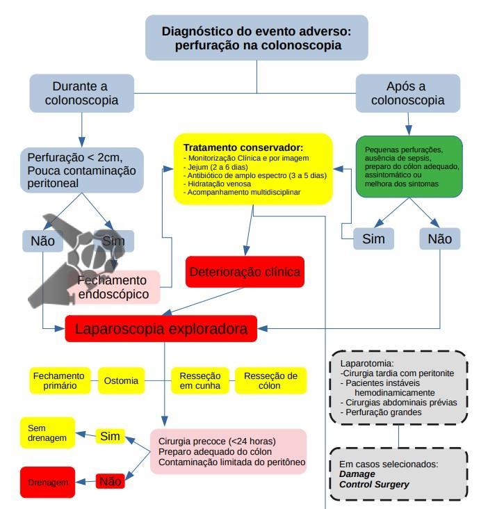 Dependiendo de diferentes factores, con el objetivo de minimizar la morbilidad y mortalidad de la perforación por colonoscopia y basándose en la guía de la World Society of Emergency Surgery [4], la conducta varía según los diferentes escenarios presentados a continuación.