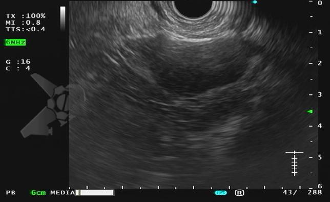 Durante el examen de ecoendoscopia, fue identificada la imagen en la adrenal isquierda: