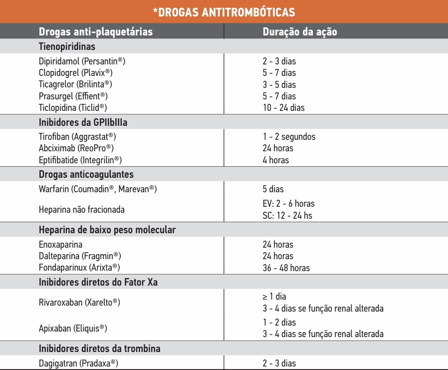 Vide resumo da tabela abaixo com o tempo de duração dos antitrombóticos equivalente ao tempo de suspensão caso seja indicado (Tabela 1).