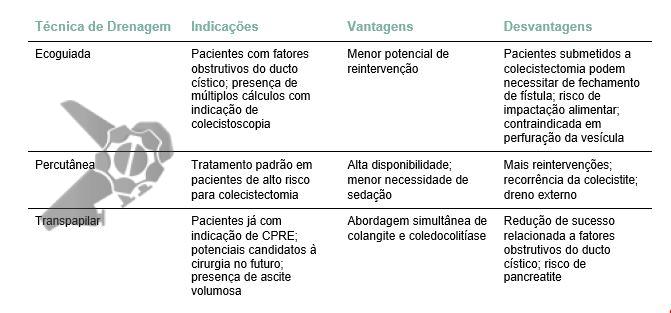 A EUS-GBD vem se tornando uma opção estabelecida no manejo de pacientes com colecistite aguda e alto risco cirúrgico, apresentando resultados favoráveis reportados na literatura. A adequada seleção de pacientes envolve abordagem multidisciplinar entre as equipes de endoscopia, radiologia intervencionista e cirurgia, devendo-se considerar fatores como comorbidades, potencial para abordagem cirúrgica posterior, características anatômicas e disponibilidade de profissionais e material.