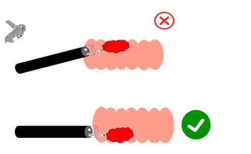 Ao contrário, quando a injeção é muito profunda, através da muscular, o líquido pode ir para cavidade peritoneal ou para a subserosa, formando uma bolha não tão proeminente e difícil de reconhecer. Isso não é incomum de acontecer no cólon, principalmente nos locais onde as paredes são mais finas, como no cólon direito. Suspeitar que a injeção está muito profunda quando estiver injetando e não houver elevação ou escape do líquido para fora. Como a submucosa não é elevada, isso prejudica a dissecção e aumenta o risco de perfuração. Nesse caso também, assim que você perceber que a injeção foi inadequada, recue a agulha para achar o plano correto ou a remova e injete em outro ponto.