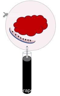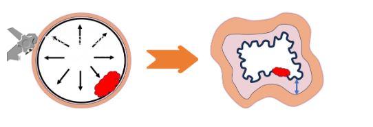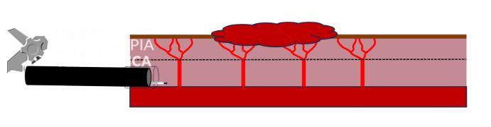 O local de injeção também é muito importante! Ao contrário da mucosectomia, quando o objetivo é elevar somente a lesão, na ESD o objetivo é obter um plano de dissecção para entrar embaixo da lesão, então a injeção não deve ser feita muito próxima à lesão (geralmente, a injeção deve ser feita a uma distância média de 1cm da lesão, para que a bolha máxima – onde será feita a incisão- fique a uma distância de 0,5cm da lesão). Lembrar que o local onde puncionamos com a agulha não é onde a bolha fica mais alta! (FIGURA 6).