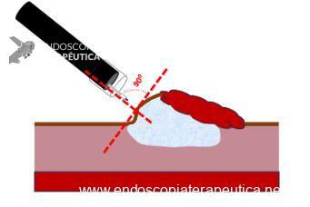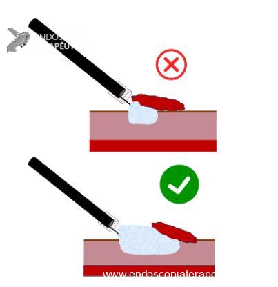 OBS: Se a lesão estiver numa prega ou for grande e séssil, injete mais longe ainda (+1,5cm) para facilitar o posicionamento do endoscópio por debaixo da lesão e evitar que a muscular fique perpendicular ao plano de dissecção.