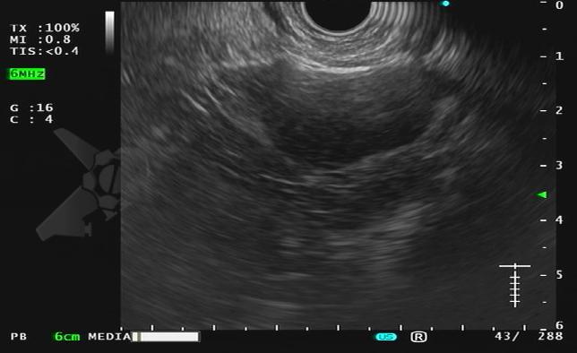 Durante exame de ecoendoscopia, a imagem a seguir foi identificada na adrenal esquerda: