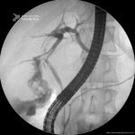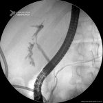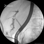 - Imagem da radioscopia mostrando fístula biliar pós-colecistectomia, com identificação de extravazamento de contraste na região do hepatocolédoco médio-proximal.
