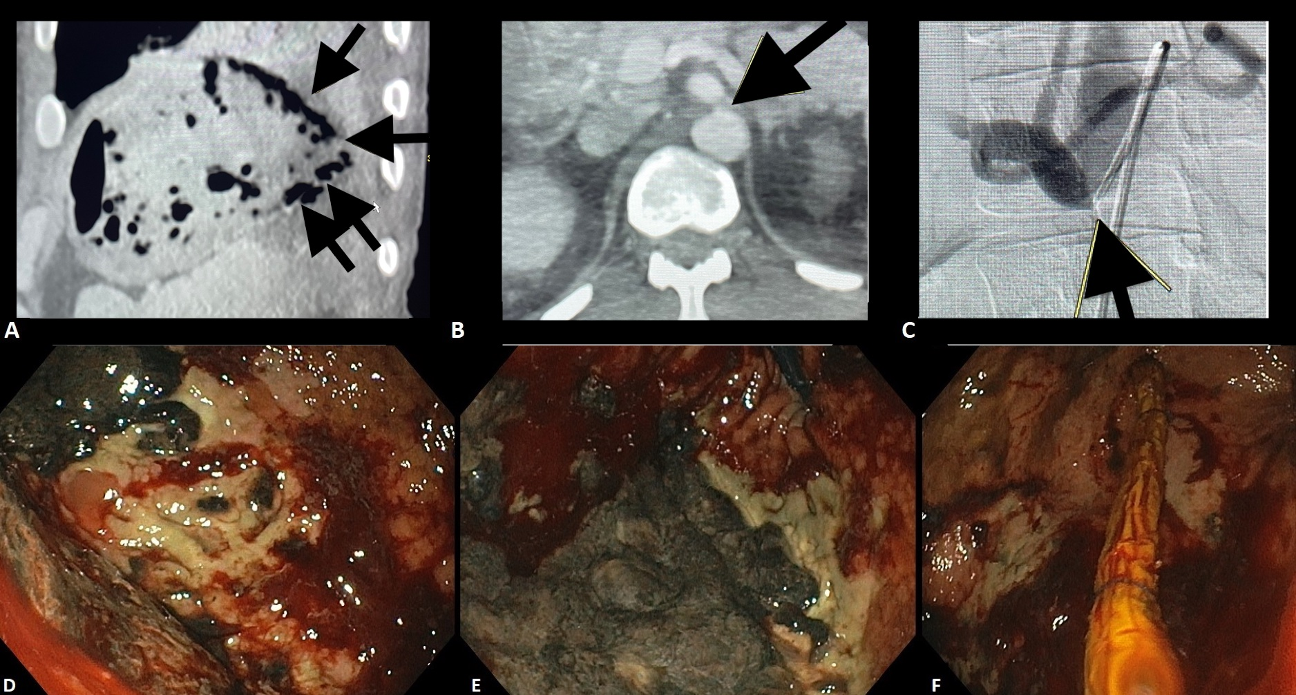Figura 2 Adaptado de Dall’Agnol et al (9): A: Tomografia abdominal com pneumatose da parede gástrica (setas). B: Angio-TC demonstrando estenose do Tronco celíaco (seta). C: Arteriorgrafia confirmando estenose do Tronco celíaco (seta). D: Úlcerações extensas e tecido necrótico com sangramento difuso no corpo gástrico. E: Tecido necrótico extenso no fundo gástrico. F: Passagem da sonda de Terapia Endoscópica a Vácuo (1a sessão).