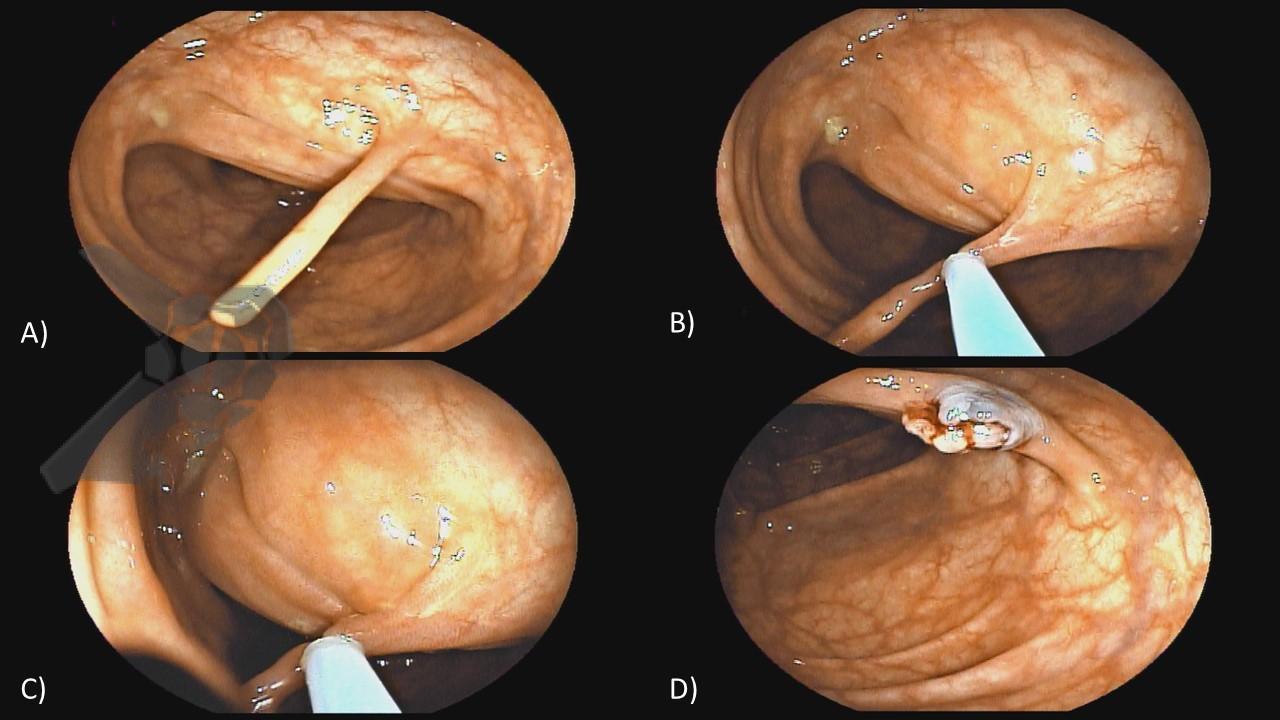A) pólipo alongado mucossubmucoso do cólon transverso; B) apreensão do pólipo com uma alça; C) ressecção do pólipo com alça a frio; D) aspeto final após a ressecção