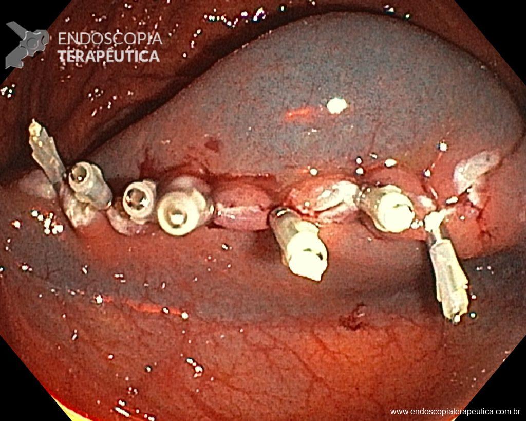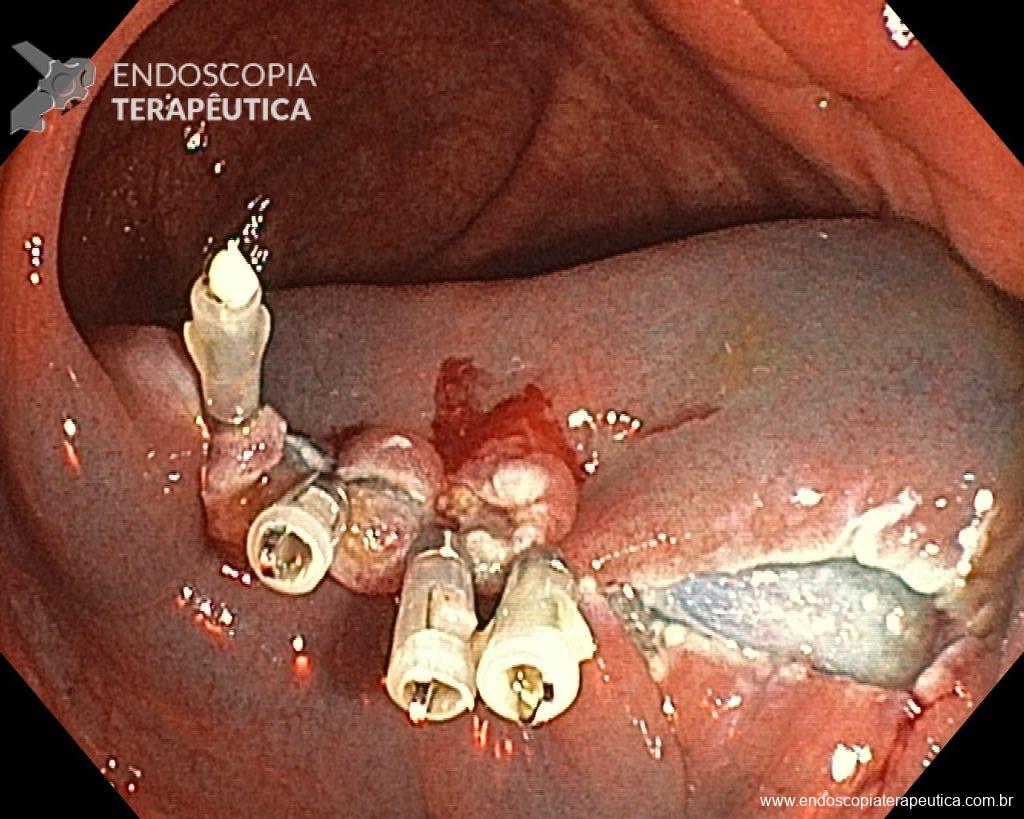Quando ocorrer sangramento intraprocedimento (IPB), não entre em pânico – é apenas um sangramento. Embora seja verdade que só a experiência prática pode deixá-lo confiante perante o IPB, esteja preparado para abordá-lo sistematicamente, como faria com qualquer outro procedimento endoscópico. Antes de iniciar o procedimento você deve se certificar que seu conjunto de endoscopia está totalmente equipado e capaz de lidar com todos os tipos de IPB. Faça uso consciente de tudo o que puder, sem entrar em pânico. Use a bomba de lavagem para remover o sangue do tecido alvo e limpar o ponto em que você precisa intervir. Se você julgar que o vaso é pequeno (até cerca de 2 mm), você pode coagulá-lo de imediato com a ponta da alça em modo de “soft coagulation”. Por outro lado, se o vaso é maior que 2 mm, a utilização de uma pinça de coagulação é uma estratégia mais efetiva. Enquanto aguarda o acessório, caso esteja usando um cap acoplado a ponta do aparelho, utilize-o como um “dedo” e faça pressão sobre o vaso. Quando estiver pronto com seu dispositivo, use a bomba de água novamente para limpar a área, abra a pinça e apreenda o vaso, tracionando-o em sua direção (e para longe da parede) antes da coagulação. O uso de coagulação com plasma de argônio (APC) durante EMR deve ser minimizado, da mesma forma com os clipes hemostáticos, que devem ser utilizados quando você já tentou de tudo e o sangramento continua.