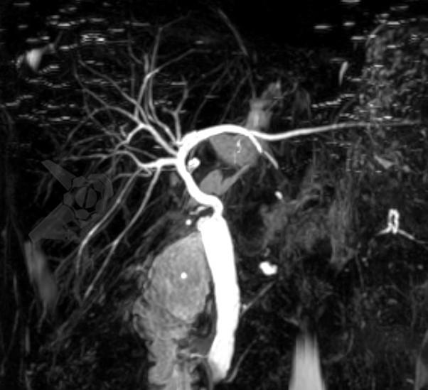 Foi submetida a ressonância magnética de abdome (RNM) com colangiorressonância (colangioRNM), que não evidenciou alteração vascular da artéria hepática, apenas desproporção entre as vias biliares do doador e receptor, sem estenose definida, porém com discreta dilatação de vias intra-hepáticas.
