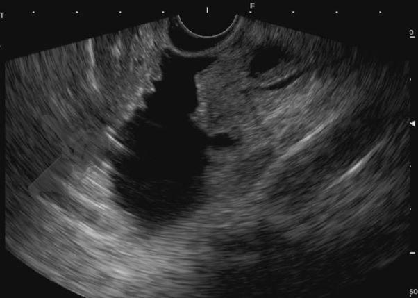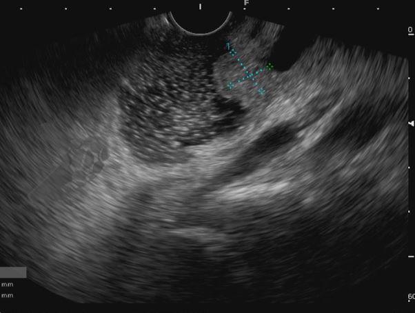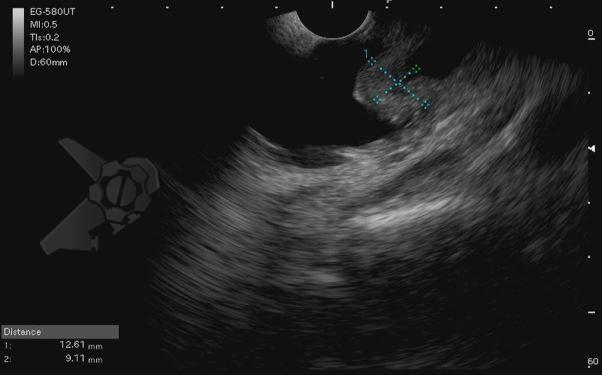 Diante da confirmação histológica de adenoma tubular com displasia de baixo grau, optado pelo estadiamento local através de ultrassom endoscópico (EUS), evidenciando lesão restrita a mucosa (sem sinais de acometimento de camada muscular) medindo 12×9 mm, com dilatação de colédoco até 9 mm e ausência de extensão intraductal.