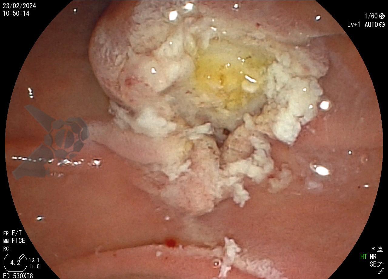 Dessa forma, indicada papilectomia endoscópica e realizada ressecção em monobloco, em modo endocut Q, sem injeção de submucosa. Não foi realizada esfincterotomia ou passagem de prótese biliar ou pancreática. Observou-se pequeno sangramento imediato no leito de ressecção, controlado com injeção de adrenalina. Não há lesão residual no leito. Paciente evoluiu bem, assintomática e sem intercorrências após o procedimento.