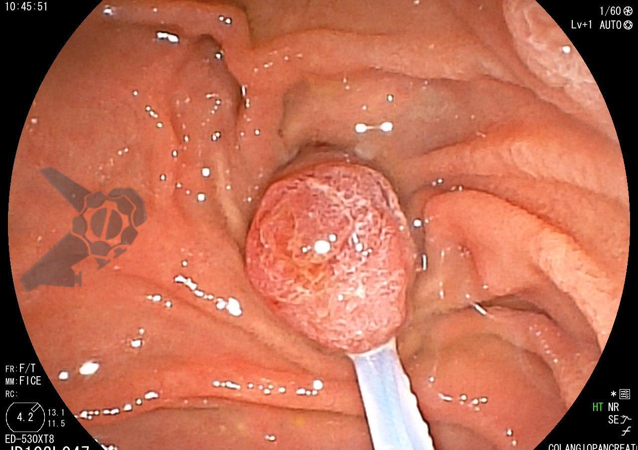 Tendo em vista quadro clínico associado a dilatação de vias biliares, foi indicada colangiopancreatografia endoscópica retrógrada (CPRE) para tratamento de possível estenose da anastomose biliar. Ao se posicionar o duodenoscópio na segunda porção duodenal, identificada lesão polipóide suspeita para adenoma de papila duodenal maior, sendo realizadas biópsias.
