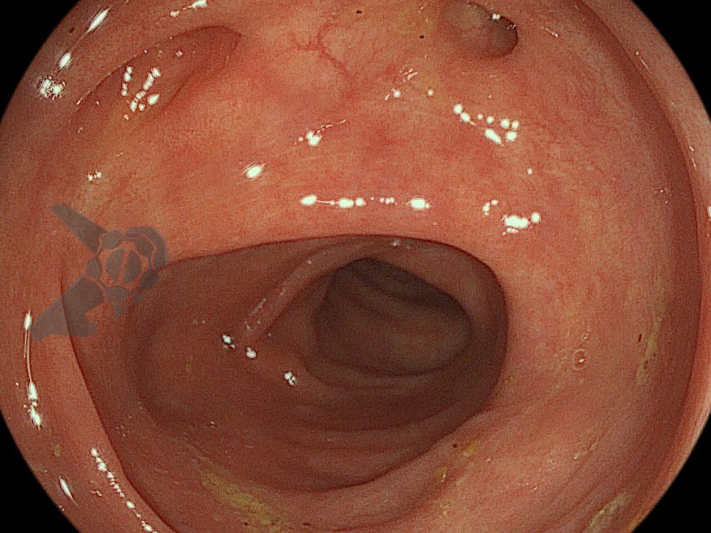 Após preparo colônico com manitol e a realização de uma nova radiografia, que não apontou qualquer mudança na posição inicial da prótese dentária desde a admissão, o paciente foi submetido a colonoscopia. Até a intubação cecal o corpo estranho não foi encontrado, com presença de doença diverticular no hemicólon esquerdo (foto 2 e 3).