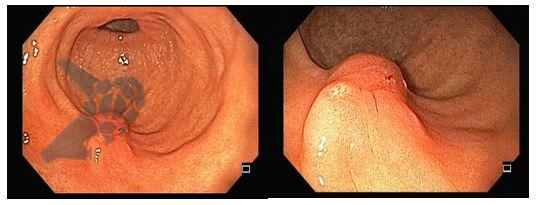 Endoscopia Digestiva Alta revela lesão plano-elevada (0-IIa de Paris), com superfície vilosa, aspecto regular, com bordas mal delimitadas, localizada na grande curvatura do antro proximal de 12 mm (Fig.1)