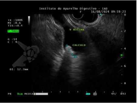 - Vesícula biliar normodistendida, com paredes finas, exibindo imagem hiperecóica e móvel, formadora de sombra acústica posterior, medindo cerca de 12 mm no maior eixo, compatível com cálculo (Foto 1);