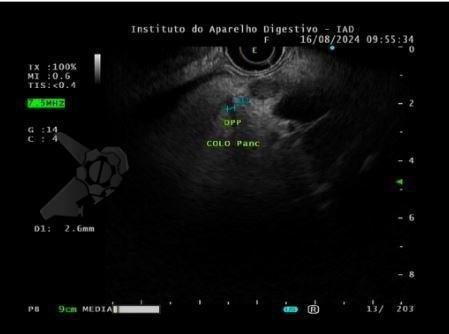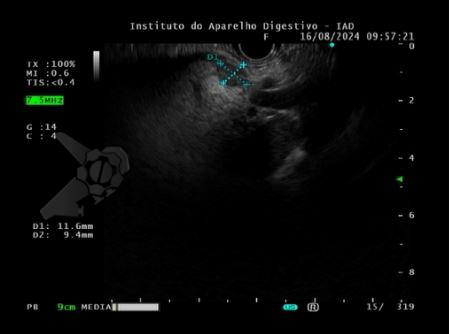 - Imagem com ecotextura hipoecóica, homogênea, arredondada, de aproximadamente 11,6 x 10,2 mm, com contornos regulares, limites precisos, sem comunicação com ducto pancreático principal ou acometimento dos vasos perilesionais, localizada em colo pancreático (Fotos 2 e 3).