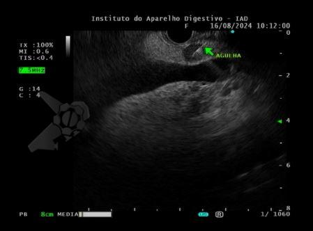 Paciente de 48 anos, hígida e sem comorbidades, foi diagnosticada com lesão sólida pancreática em investigação de dispepsia dor abdominal em cólicas em hipocôndrio direito após refeições, com realização de exames prévios de ultrassom de abdome total e tomografia de abdome. Foi então encaminhada para realização de ecoendoscopia para avaliação e biópsia da lesão. Com os seguintes achados: